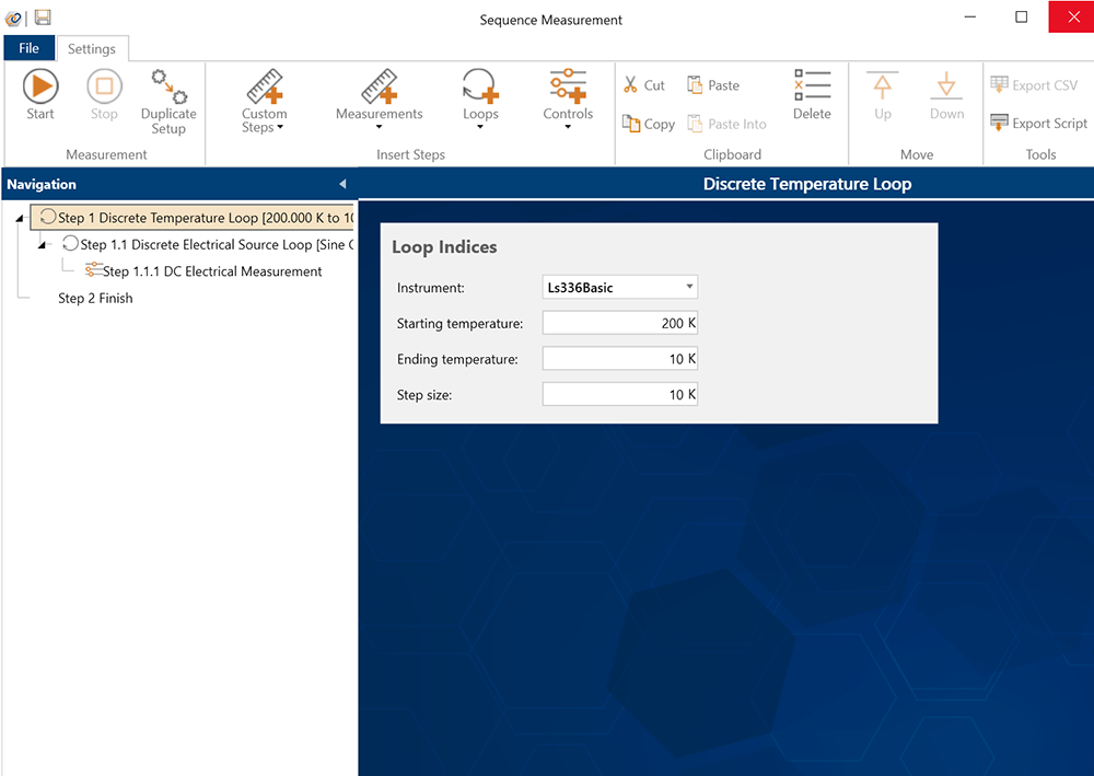 In a temperature-dependent electrical measurement, Step 1 would be to set up a discrete temperature loop, with start, end, and step temperature values.