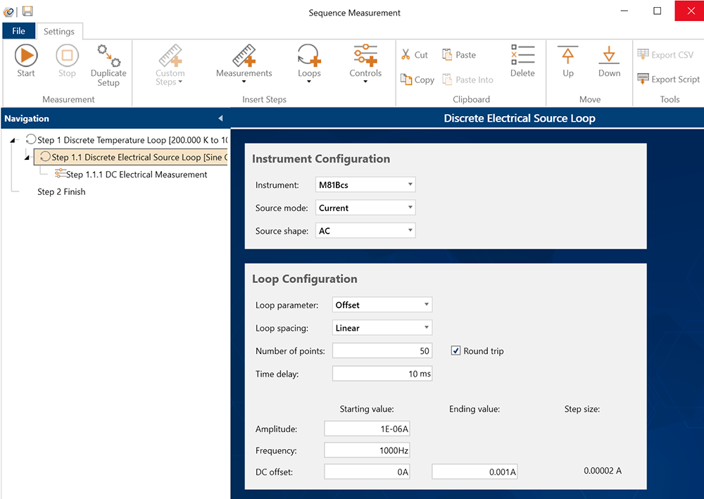 Step 2: Configure the electrical source sweep, which includes specifying the instrument, source mode (voltage or current, source shape [DC or AC]), followed by the loop configuration parameters, such as sweep variable (amplitude, frequency, or offset) and related start, end, and step parameters.